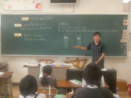 水をとじこめた注射器を押してみて、空気の時と同じように縮めることができるかどうか実験しました。