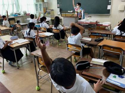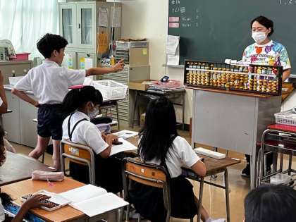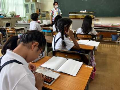 4年生の算数の授業、少人数制で学年を3分割しています。この時間はそろばんです。