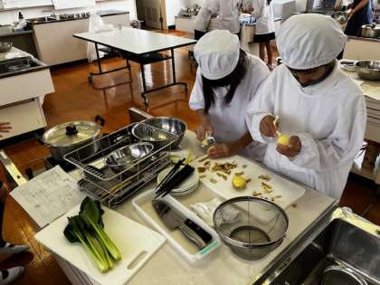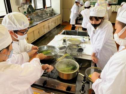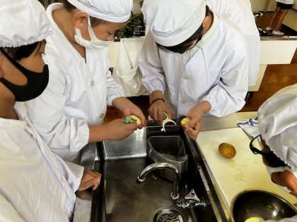 今日は5年生の調理実習です。メニューは、ゆでじゃがいもと小松菜のおひたしです。