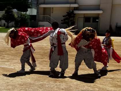 昨日、今日と長良八幡宮の祭礼です。朝から獅子舞が町内を練り歩き、最後に豊仁小学校の運動場で集結して祈祷の舞をしてくれました。