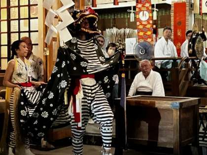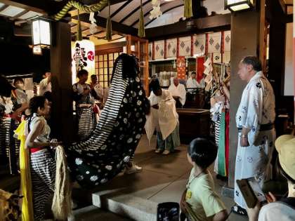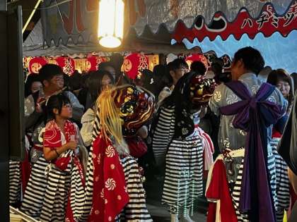 午後8時、祭礼のクライマックス、獅子舞の奉納が行われました。軽快な笛と太鼓の演奏の中、獅子の舞が境内で行われました。