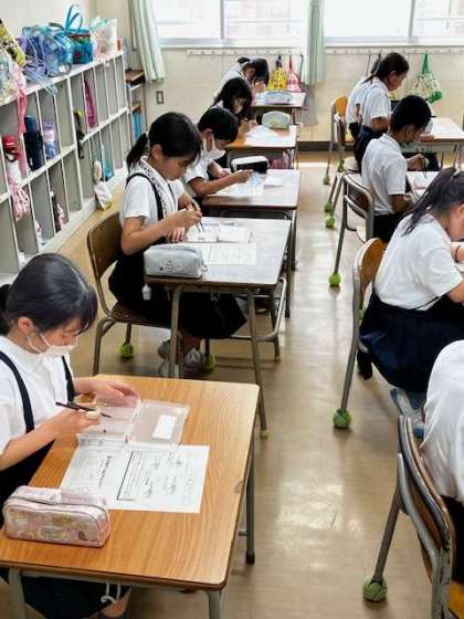 3年生で「豆つかみ」をしていました。これは、「おはしの正しい使い方」の一環で、矯正箸(きょうせいばし)を使って、正しいおはしの持ち方を練習するものです。