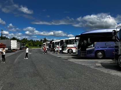 たくさんの観光バスが止まっています。大阪市の学校が林間でほぼ同じ方面に向かっています!