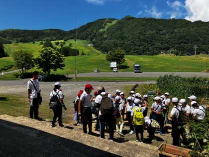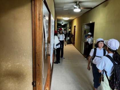 着替えの後、避難訓練をしました。館内放送での指示で、素早く館外に出て、班員の確認をします。