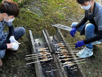 魚のつかみ取りから約2時間、宿の方がずっと炭で焼いてくれています。80匹のアマゴ。ありがとうございます!
