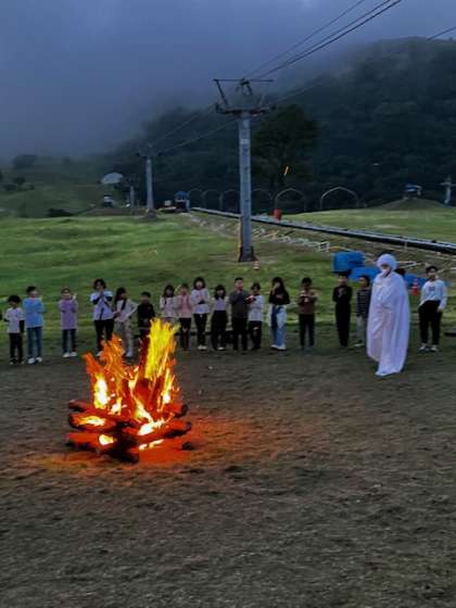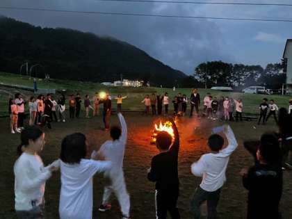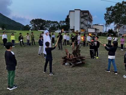 日暮れとともに始まったキャンプファイヤー。火の神が7人の従者と登場し、豊仁小学校5年生のみんなの心の中に「優しさ・勇気・絆」の火を灯す為に大きな炎を燃え上がらせました。