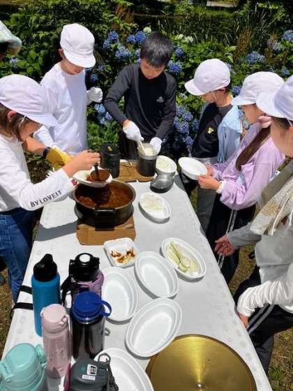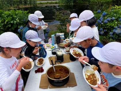 カレーライスづくりが完成しました。2時間かかりましたが、どの班のカレーも美味しくできあがりました。