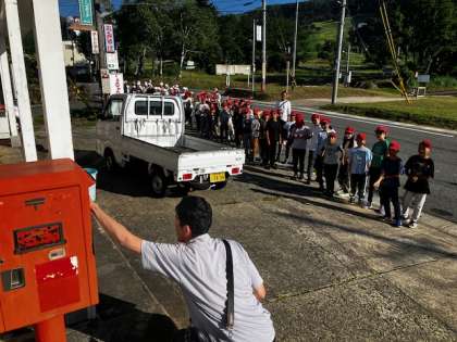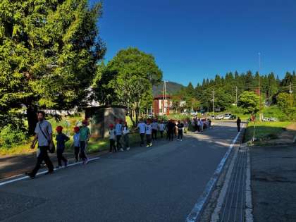 朝のつどいの後、近くの郵便ポストに、一人一人がおうちの人などに書いたハガキを全員で投函しにいきました。