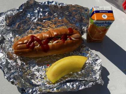 今朝のメニューは、カートンドッグ・バナナ・オレンジジュースです。 「いただきます!」