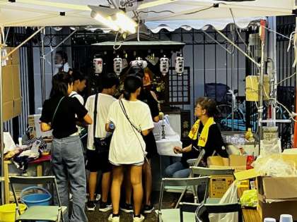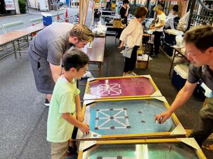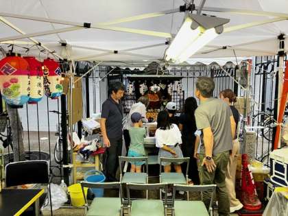 まずお地蔵さまに手を合わせてからお菓子をもらいます。地域の皆さんが、たくさんの食べものやゲームを用意してくれています。