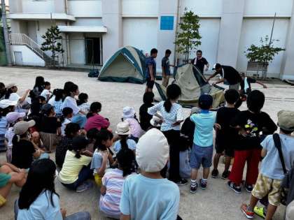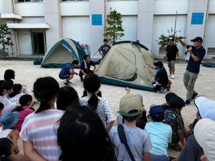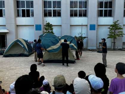 カレーの次は、今晩寝るテントをつくります。作り方手本を聞きながら覚えます。
