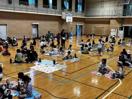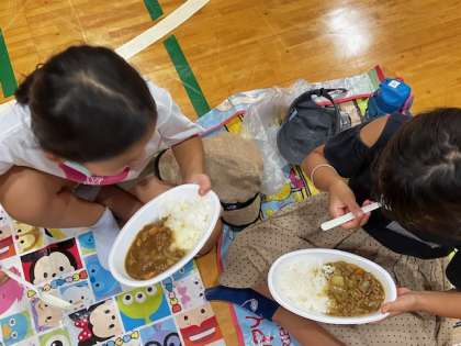 いきなり、雷がとどろき始めたので、急きょカレーは体育館で食べることにしました。