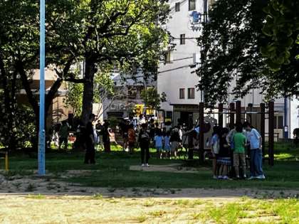 朝食後は、運動場、校舎内や公園の清掃をします。
