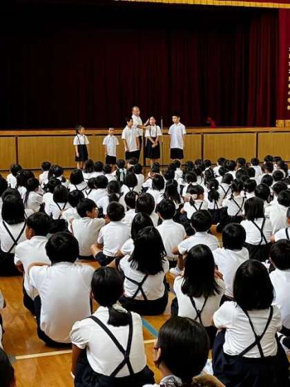 はじめに、この夏に中国から渡日して豊仁小学校の仲間になった5人の転入生の紹介をしました。