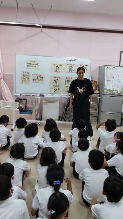 始めに、保健室の先生から、「けがが多い場所はどこか」クイズと、「けがの手当ての仕方」についてのお話がありました。