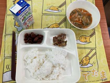 今日の給食献立は、ご飯・豚肉の甘辛焼き・冬瓜の味噌汁・金時豆の煮物・牛乳です。