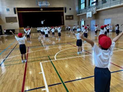 1年生の体育の時間。運動会の集団演技の練習です。基本的には体育の時間に各学年が練習をします。運動場と体育館の割振りをしています。