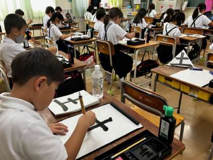 3本の線をタテヨコに書くだけですが、筆を入れる所、伸ばす所、止める所、なかなか難しいですね!