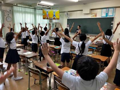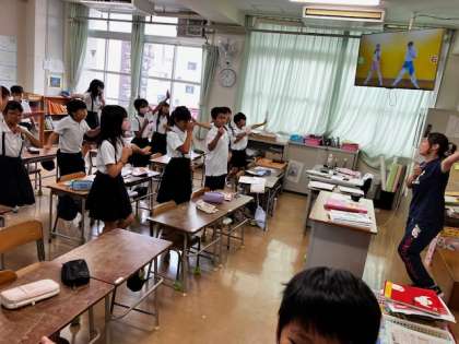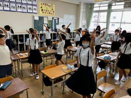体育館では他学年が練習しているので、教室でダンスのビデオを観ながら練習しています。
