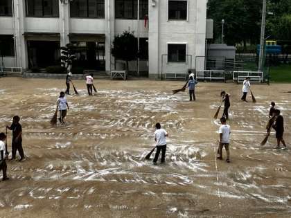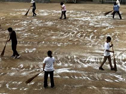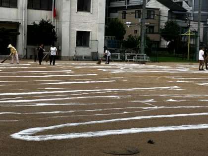 運動会前、運動場の状態を良くするためににがりを撒きました。最近、急な土砂降りが続いていたので、延期していました。今日も午後にすごい土砂降りがありましたが、さっと水が引いたので、その上からにがりを撒きました。なじみやすそうです。