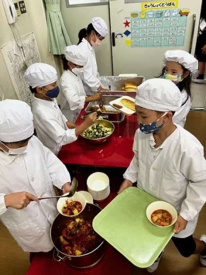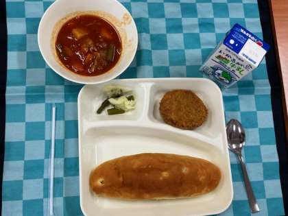 今日の給食献立は、おさつパン・チキンレバーカツ・ケチャップ煮・グリーンアスパラガスとキャベツのサラダ・牛乳です。