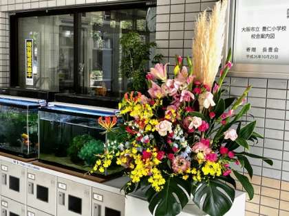 日曜日の敬老大会の際に講堂に生けられていた花が場所を変えて玄関に。