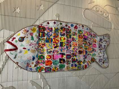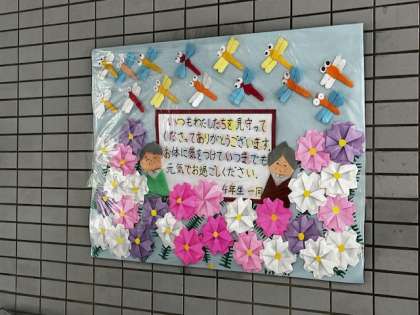 子どもたちの作品とともに、玄関が華やかです。玄関脇の塀にも作品を掲示していますので、おそばを通られる際には、ご覧いただけるとありがたいです。