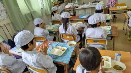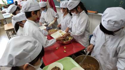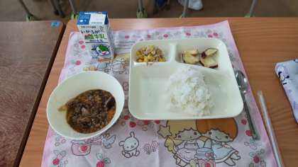 今日の給食献立は、マーボーなす、ツナと野菜のいためもの、焼きさつまいもの甘みつかけ
