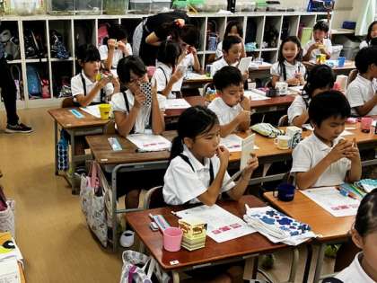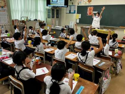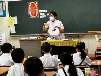 2年生で歯みがき指導をしました。歯科衛生士さんに来ていただいて、歯垢(しこう)のお話や歯ブラシの使い方について、丁寧に教えてくださいました。