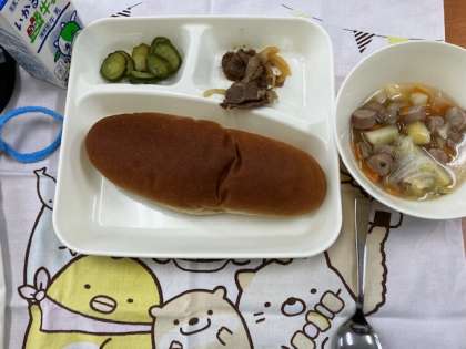 今日の給食献立は、黒糖パン・牛肉のデミグラスソース煮・きゅうりのピクルス・スープ・牛乳です。