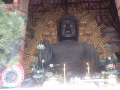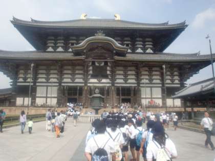 (上)世界最大の木造建造物である東大寺の大仏殿です。大変混雑していました。