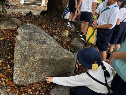 大阪城築城の際の石垣用に川で運ばれてきた石です。旧淀川はくねっていたので、運搬船から落ちてしまって使われなかったので、「残念石」と呼ばれます。淀川の付け替え工事の時に発見されました。