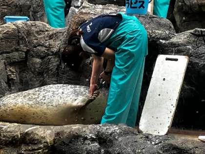 ゴマフアザラシに飼育員さんがエサをあげています!