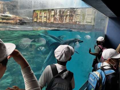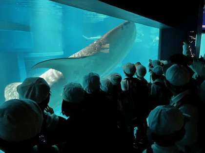 イルカの水槽を過ぎると、大水槽でした。いきなりジンベエザメが!