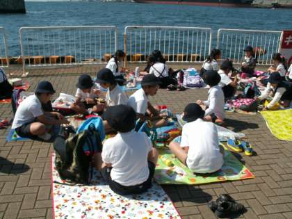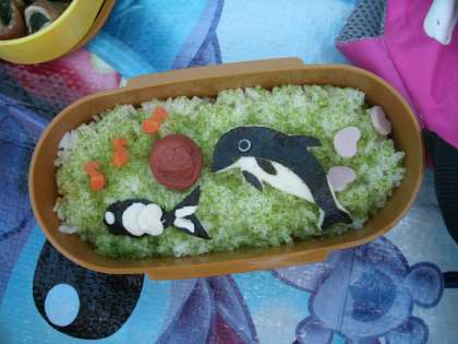 海のそばでお弁当を食べました。天気がよくていい気持でした。キャラ弁も海の生き物でした。
