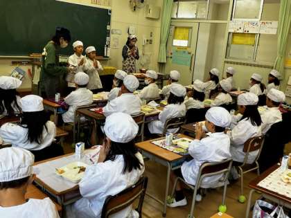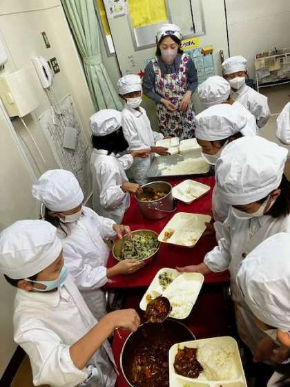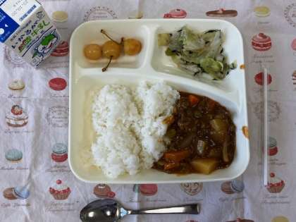 今日の給食献立は、ハヤシライス(米粉)・キャベツのひじきドレッシング・さくらんぼ(缶詰め)・牛乳です。