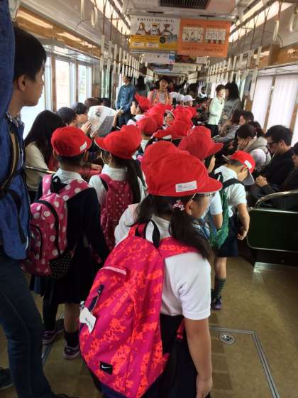 天六から阪急電車に乗って予定通りに北千里に向かっています。みんな行儀よく並んで乗っています。
