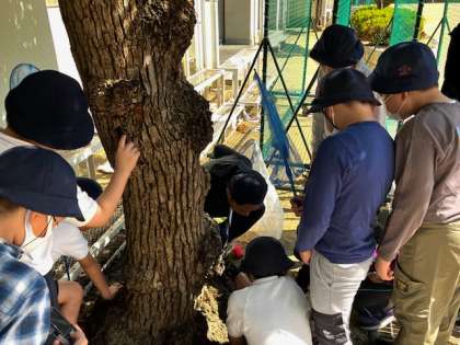 前回同様、大阪自然環境保全協会の方々が10名ほど来校してくださって、プロの虫取り網を使ったりして、校内の生きものをいっぱい見つけてくださいました。見つけるのは子どもたちですが、小さな虫やアリまで、それぞれ固有の名前を教えてくれるだけでなく、なぜその木にその虫がいるのかというお話もしてくださっていました。