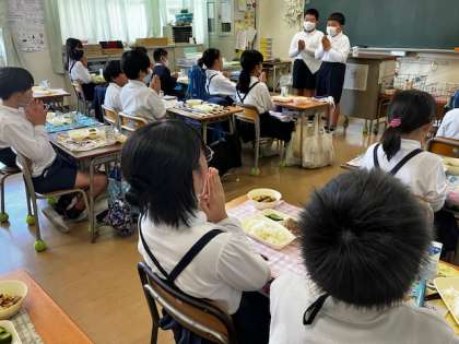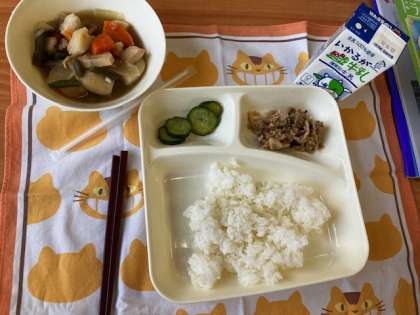 今日の給食献立は、ごはん・豚肉のねぎ醤油焼き・ふきよせ煮・きゅうりの甘酢漬け・牛乳です。