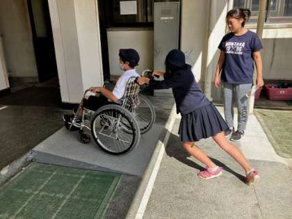 4年生で、車椅子体験をしました。インフルエンザで一旦延期していた授業です。