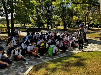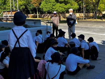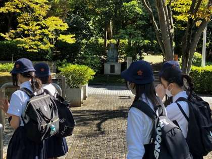 最後に博物館の指導員さんに感想やお礼を言って、博物館を後にしました。千利休像の横を通って、昼食場所に移動します。