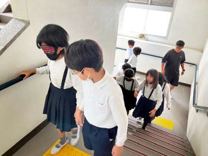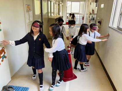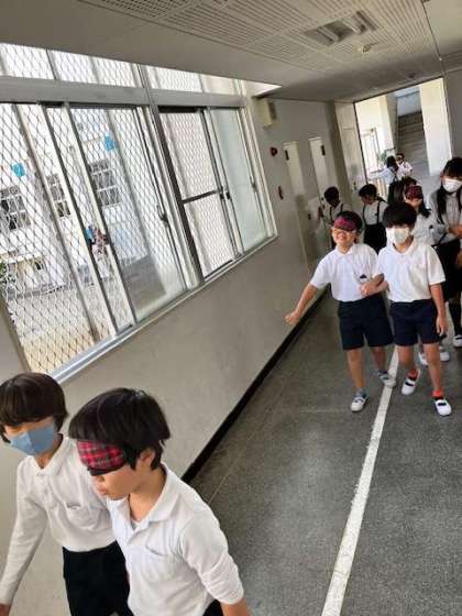 3年生でアイマスク体験をしました。アイマスクをして、2人ずつ校舎内を歩きます。