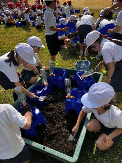 1年生がチューリップを植えました。一人ずつ、一鉢に球根一個を植えました。