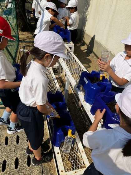 これから毎日、それぞれが自分の鉢にお水をかけてあげます。ちゃんとお水をあげ続ければ、春には色とりどりのきれいなチューリップが咲いて、新入生を迎えてくれることでしょうね!