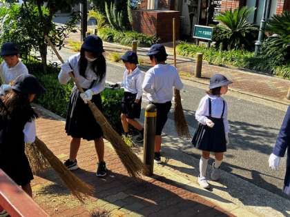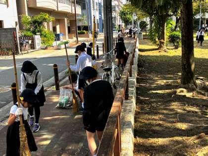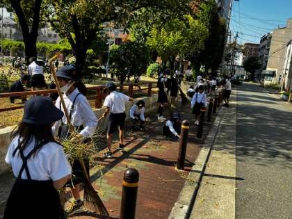 400名の子どもたちと先生方がそれぞれの分担区域を掃除します。公園周りの溝や雑草もきれいにします。