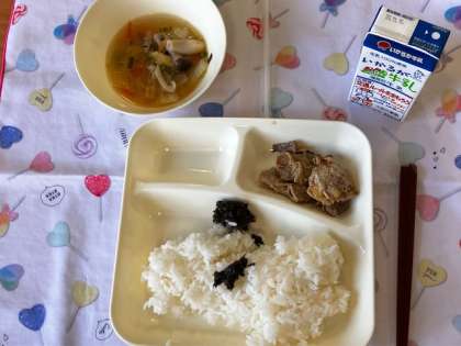 今日の給食献立は、ごはん・豚肉のスタミナ焼き・海苔の佃煮・すまし汁・牛乳です。