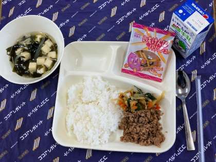 今日の給食献立は、ピビンパ・わかめスープ・芋けんぴフィッシュ・牛乳です。