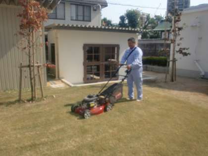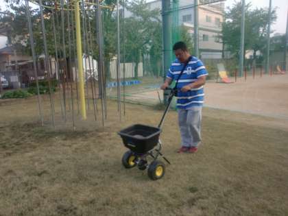 芝生広場と遊具広場に冬芝の種を蒔きました。