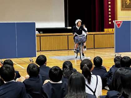 実際に5年生と6年生の各クラス一人ずつ、交差点での乗り方をしてもらいました。「右見て左見て、もう一度右見て」。最後にアニメで、自転車の交通ルールや大切なことを学びました。