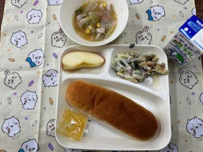 今日の給食献立は、コッペパン・ほうれん草のグラタン・スープ煮・りんご・マーマレード・牛乳です。
